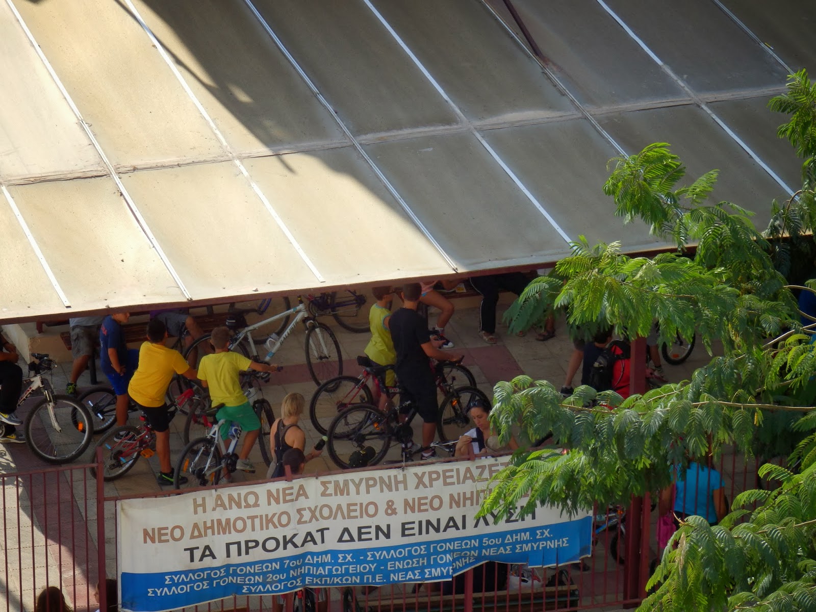 Σήμερα 22-09-2013, πανευρωπαϊκή μέρα χωρίς αυτοκίνητο, το σχολείο μας πραγματοποίησε ποδηλατοβόλτα-ποδηλατοπορεία διασχίζοντας σχεδόν όλη τη Νέα Σμύρνη. Η συγκέντρωση (περίπου 60-70 ο αριθμός των ποδηλατών) έγινε στην αυλή του σχολείου μας, και αφού μας έδωσαν οδηγίες οι επικεφαλείς της βόλτας μας, ξεκινήσαμε περίπου στις 10:30, συνοδεία έμπειρων ομάδων ποδηλασίας , οχημάτων περισυλλογής (χρειάστηκαν σε 2-3 περιπτώσεις), αλλά και της τροχαίας Καλλιθέας. Η διαδρομή μας, εκκίνηση από το σχολείο, Ευξείνου Πόντου, συνεχίσαμε έως τη συμβολή Βενιζέλου με Αχιλλέως (πρατήρια) και μέσω της Βενιζέλου, καταλήξαμε για μία στάση ξεκούρασης στο Άλσος. Η βόλτα μας στους δρόμους της πόλης εξελίχθηκε ομαλά, αν και δεν έλειψαν τα απρόοπτα, όπως το επεισόδιο με τον "κανίβαλλο" μοτοσυκλετιστή, που ενοχλήθηκε επειδή του έκοψαν το δρόμο οι ποδηλάτες! Με... παρέμβαση τρίτων, ο ανάγωγος συμπολίτης μας μπήκε στη θέση του.